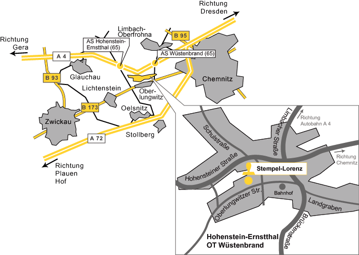 Der Ortsteil Wüstenbrand von Hohenstein-Ernstthal ist bequem mit dem Auto über die Autobahn A4 oder die Bundesstraßen B173 und B180, aber auch per Zug über die Sachsenmagistrale zu erreichen.